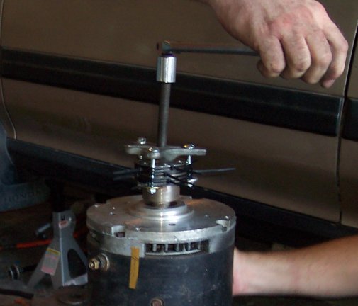 We break for lunch and try again after half an hour. Stuff keeps getting in our way. First the transfer case is holding the adapter plate, and the motor is attached to it from the inside. Then the body won't let us move it far enough away from the transmission to just drop it. We can't take the cap off, because it has to slide off the shaft; besides, we can't do that in reverse to put the new motor in (the brushes and commutator would be in the way).