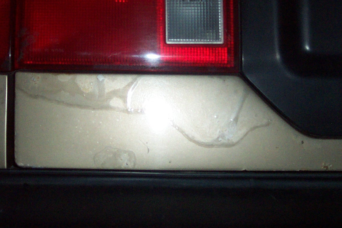 Bad news! The clearcoat has separated from the paint on the bottom driver's side corner of the hatch. Water gets stuck in there. I pricked it with my keychain screwdriver, but I couldn't squeeze all the paint out.