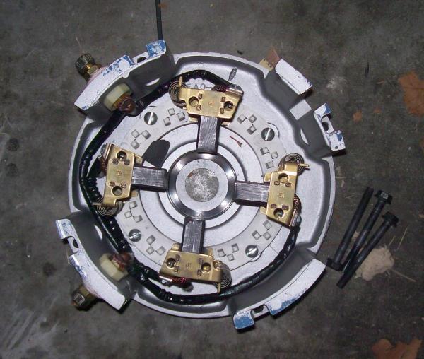 Normally these motors ship with three holes (+10 degrees, neutral, and -7.5 degrees), but when Nathan tried to move the brushes, he found there were only two holes. The EV list told us we had a very old motor, with one setting for neutral and the other for 10 degrees advanced. We guessed on which way was neutral, and drilled holes in the opposite direction at 3/4 the distance. Unfortunately, we guessed the wrong direction, so our motor was 17.5 degrees advanced -- or, for our reverse rotation, 17.5 degrees retarded.