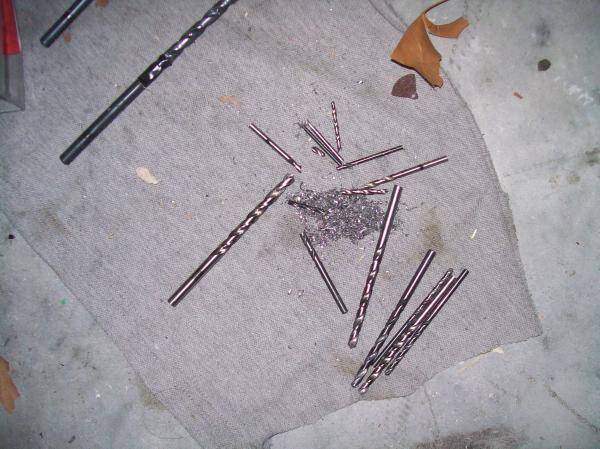 Of course, the bit is harder than the surrounding steel. It's tough to drill through a drill bit. We got the bright idea to use our smallest remaining bit to drill out around the bit. That got us another broken bit.