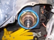 Then we dropped the motor. It levered down until it presented the brush endcap right through the driver side wheel well. We pulled the brush cap off, exposing the commutator and the casing, ready to drill.