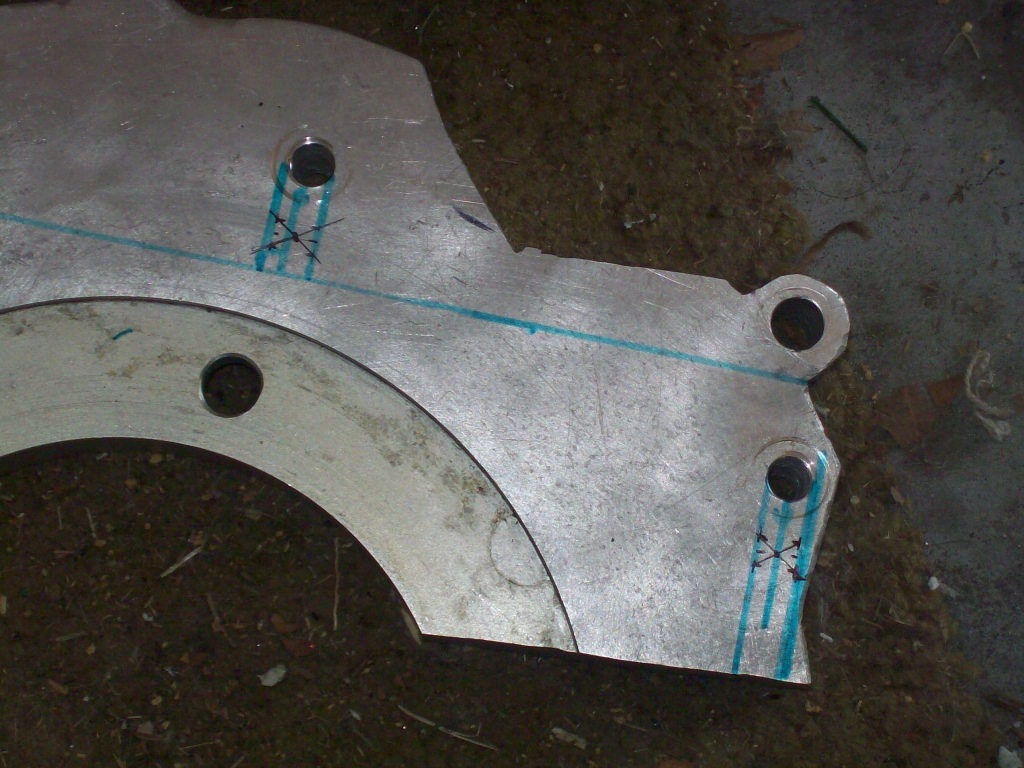 I carefully marked two spots on each of those lines, measure 9/16 and 13/16 from the intersection with the bolt hole. Then I drew lines between opposite corners. Voila! The intersection marks the center of a circle 11/16 forward from the center of the existing bolt hole.