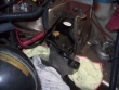 By the time I got back from my second trip, Nathan had bolted the transmission into place. Everything fit correctly this time. We used the motor mount to guide the half-inch bit, making a nice funnel as a mark. Then we covered everything with shop rags and started drilling the top hole.