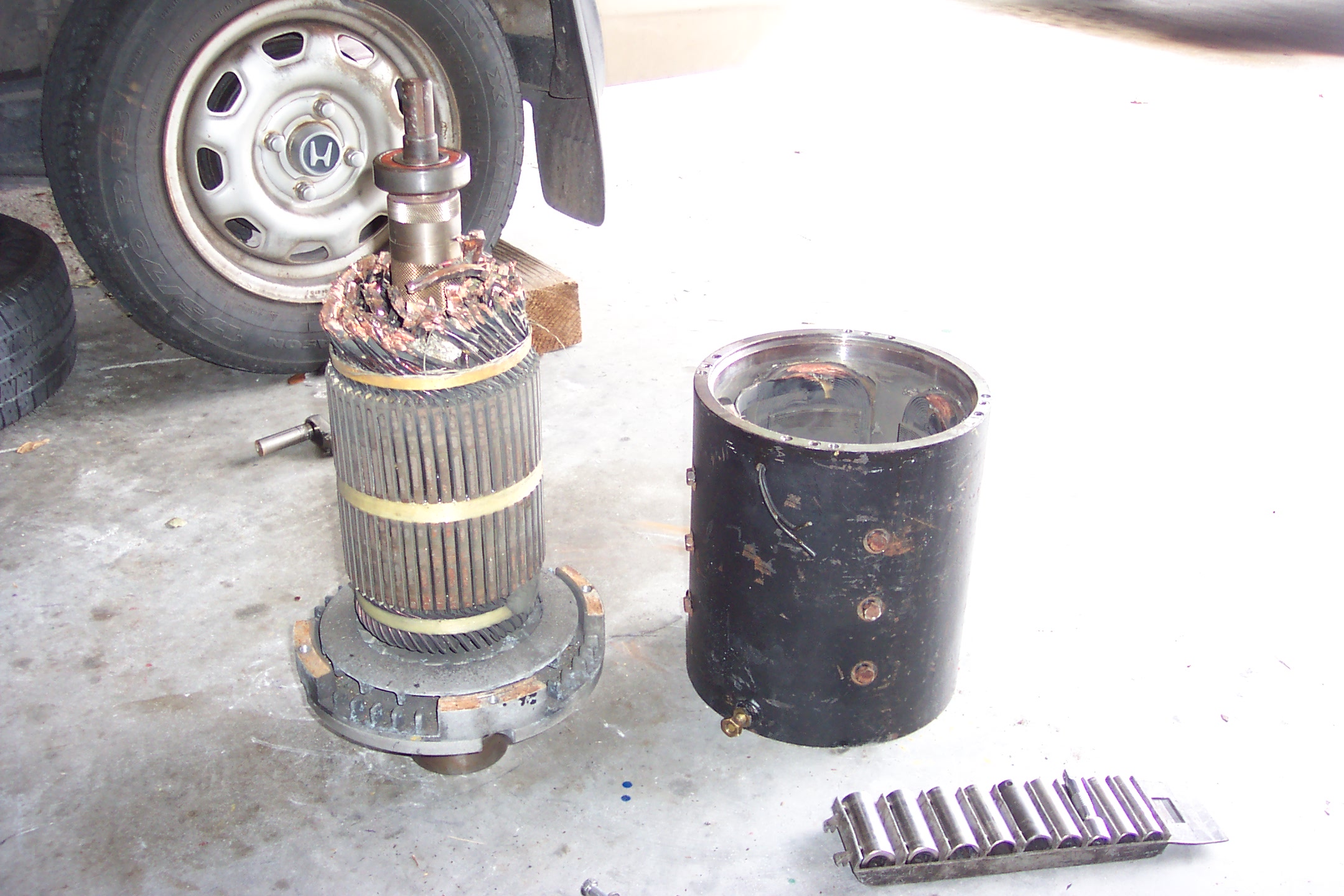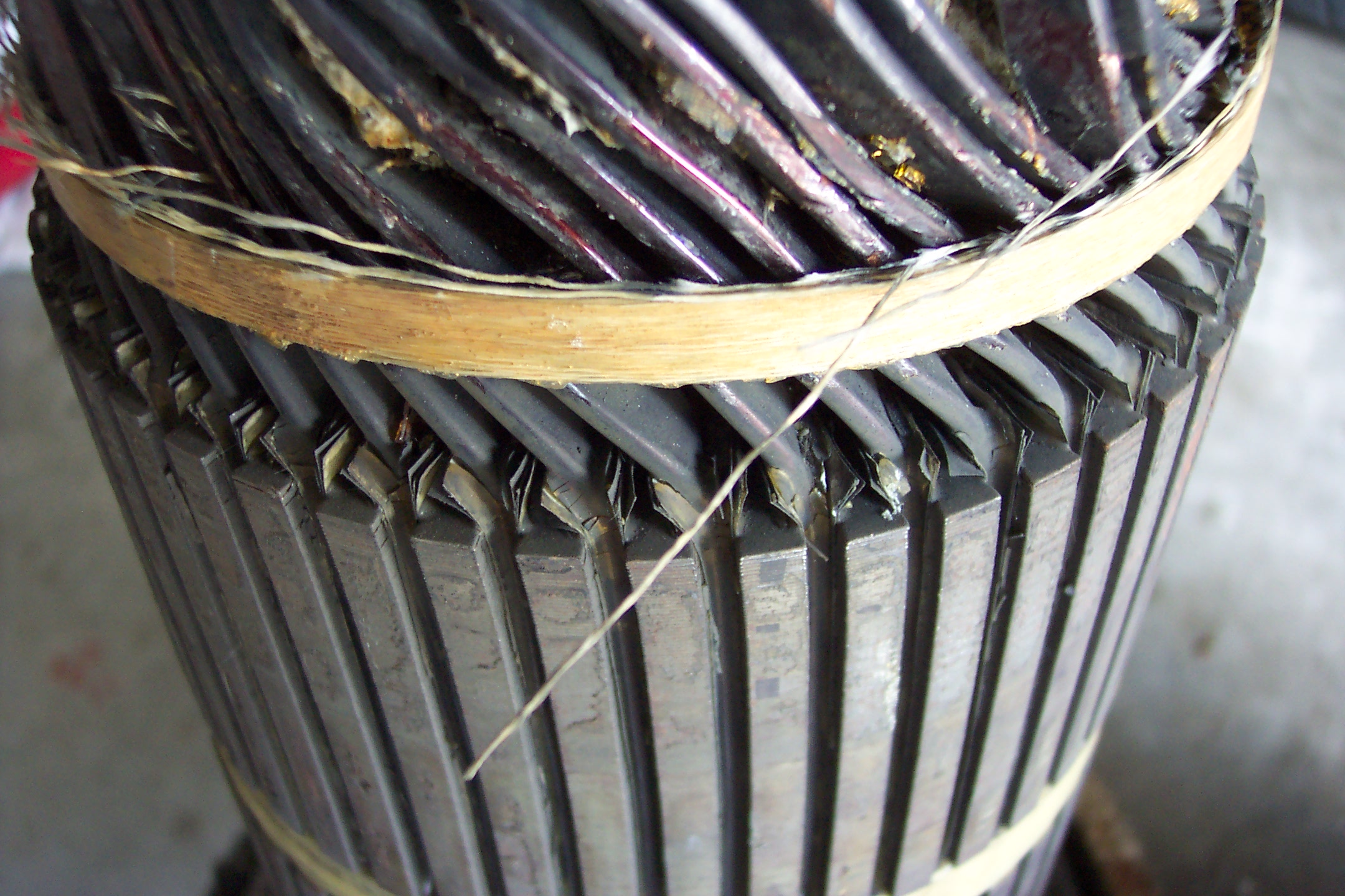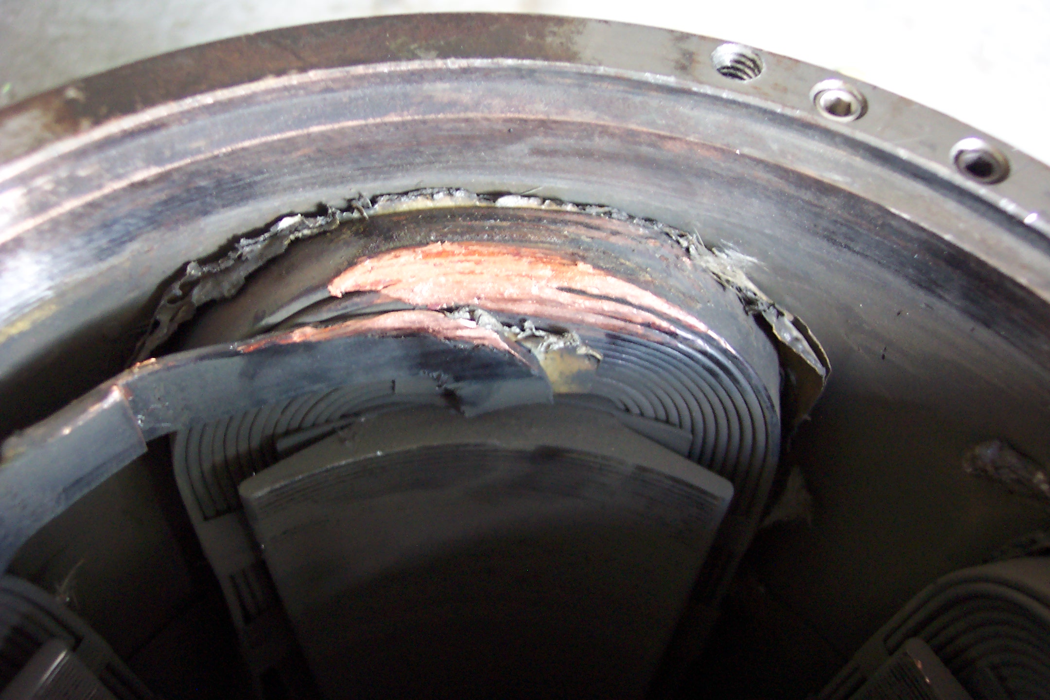 With a prybar, a giant screwdriver, and a hammer, getting the centrifugally-exploded wires bent upwards was no great task. A little time-consuming, but no big deal. And it let me get pictures of the field coils.