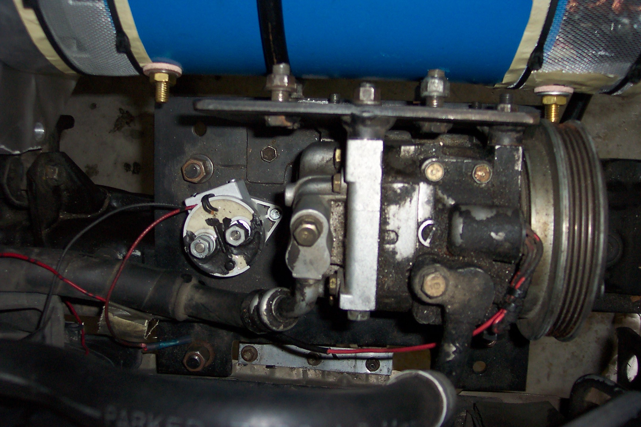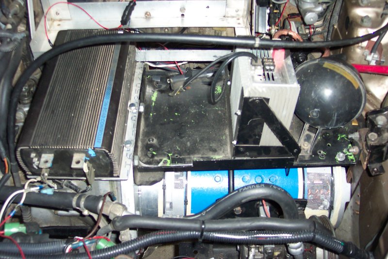 Then began the real nasties. Much ratcheting of wrenches, pulling of prybars, and exercise of previously obscure musculature came into play. (For instance, cranking a socket wrench in 135 degree arcs at a strange angle, while holding the giant extension and bent over a car on jackstands at their highest extension, will strain muscles in your shoulders and back you never knew you even HAD.) We tightened all the mounts, installed the A/C compressor bracket over the front crossmember, installed the A/C compressor onto its bracket, installed the big accessory tray, and installed the controller onto the holes drilled in the adapter.