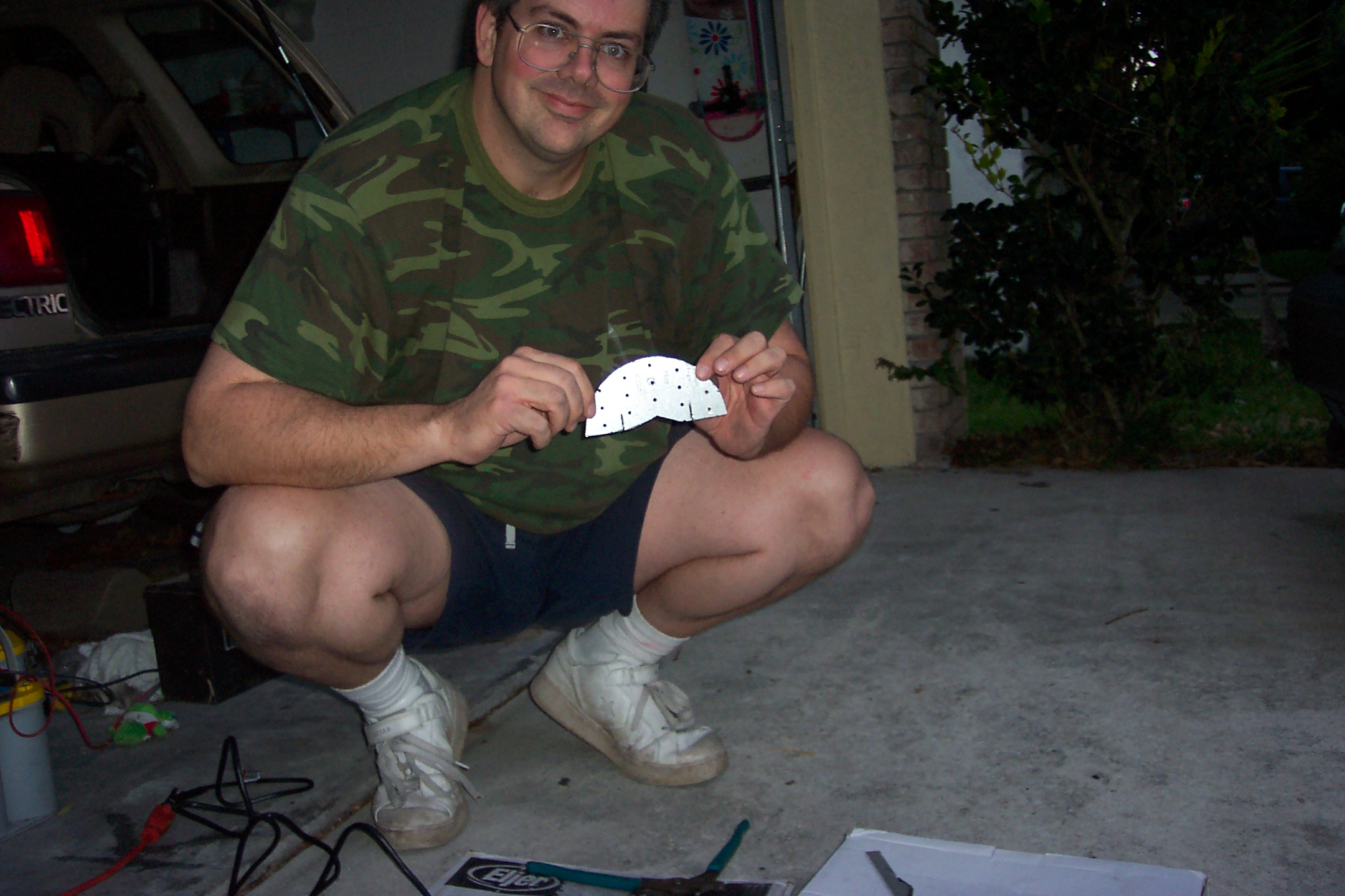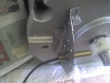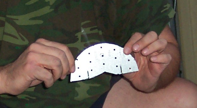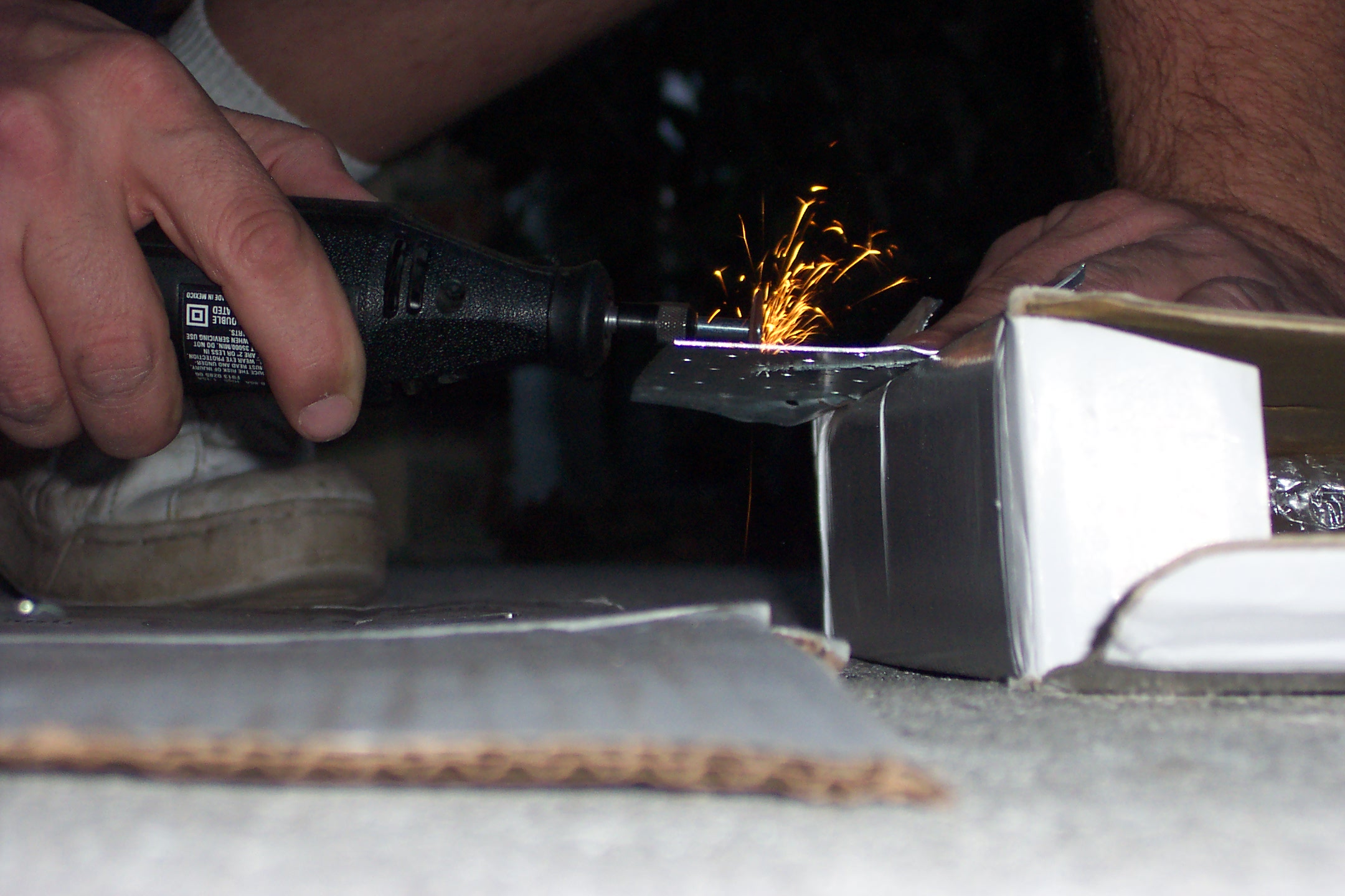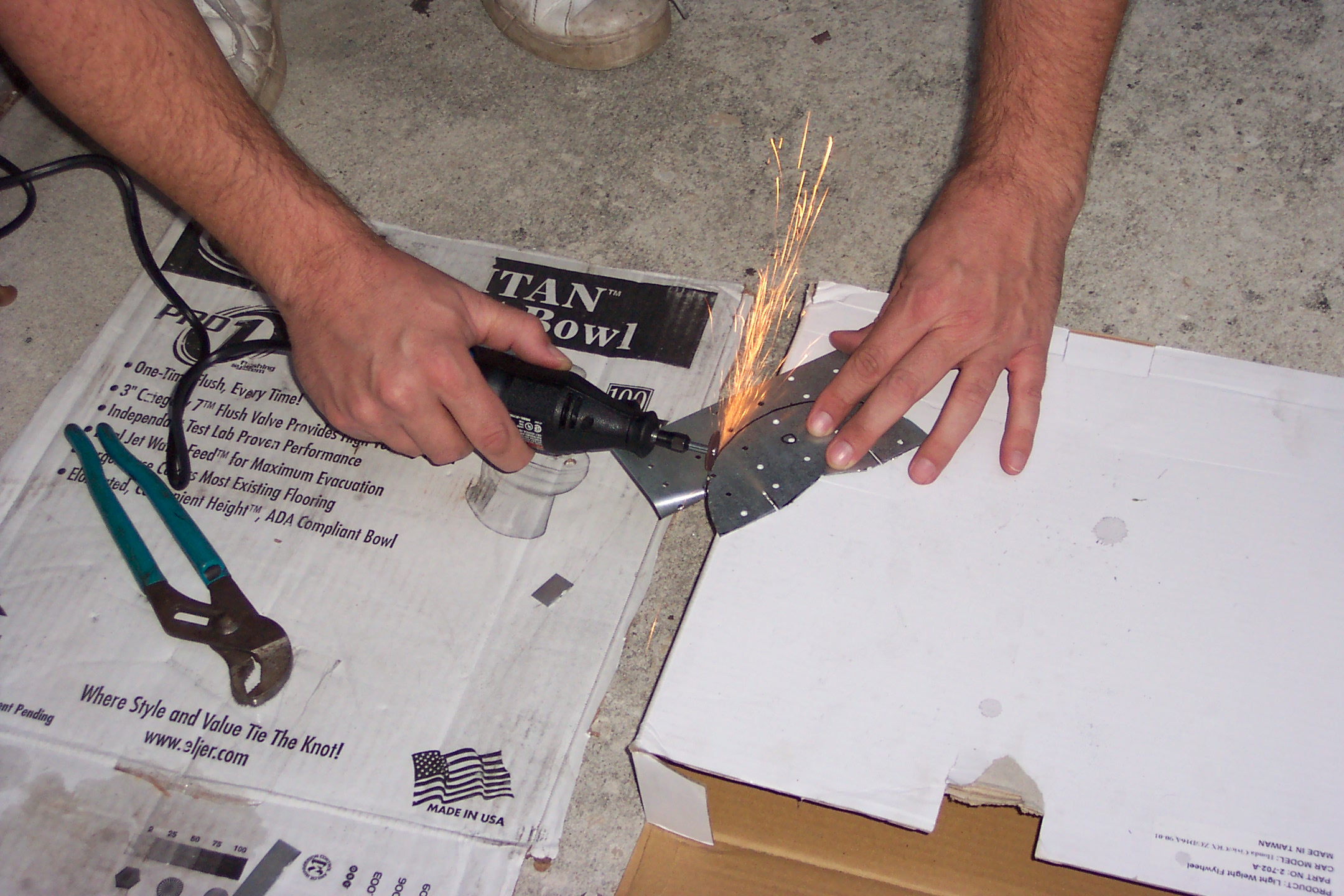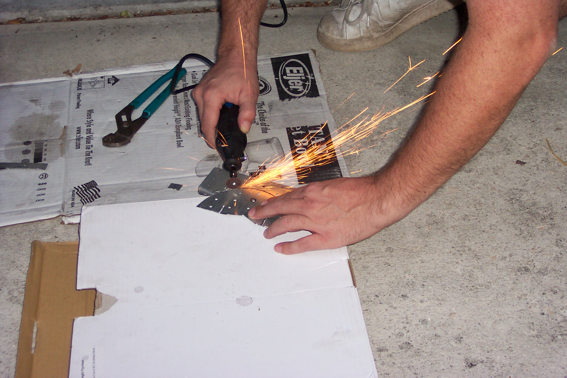 The kids loved this part. I used up two cutting blades getting my template cut. The sparks flew! (Far away from the charging batteries and any petroleum products.) Luckily the holes were all perfectly positioned, so I had guide holes for the drilling. I made them a little oblong to take care of any alignment issues, let the steel cool, and bent it with pliers and a hammer. It fit on the first try. I'm really proud of this bit, as it's the first thing I've built entirely on my own for this project.