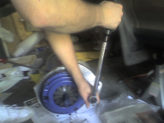I installed the flywheel, torquing it to 75 ft-lbs instead of the required 76 ft-lbs, because my torque wrench doesn't go any higher. Melissa set the torque wrench for me, and she did a good job. She loves these applied mathematics problems.