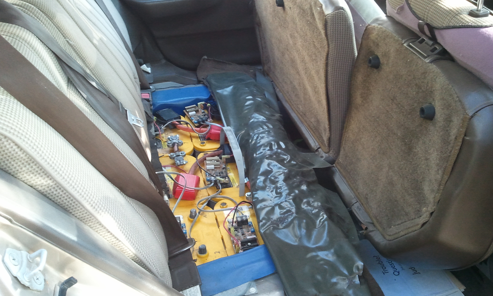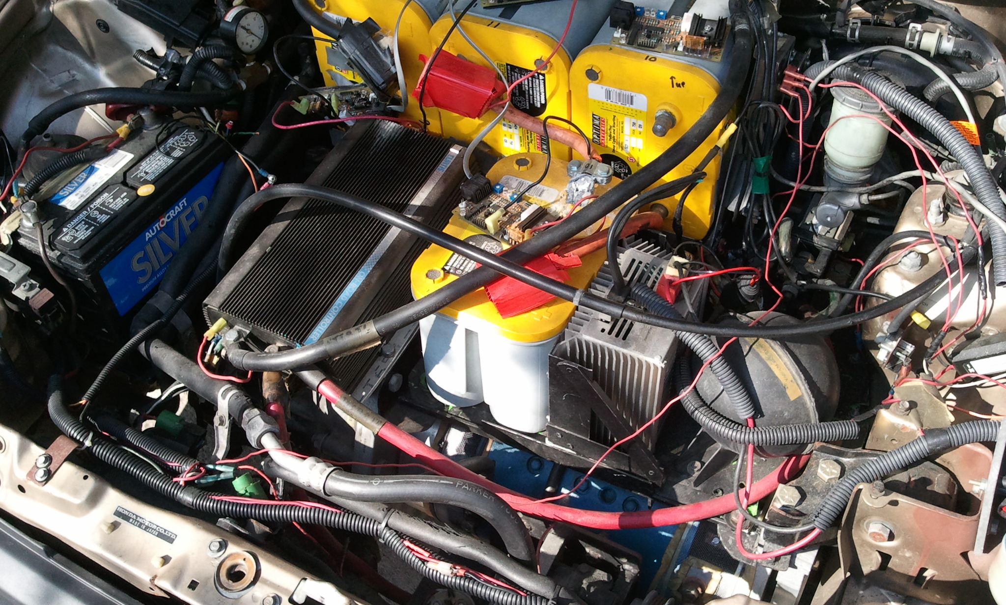 New batteries will be required. Silent E was originally outfitted with 12 Optima YellowTop D34 batteries. 8 of the batteries fit in the back, under the seat (which lifts up to reveal them); the other 4 are in a rack under the hood. These batteries are the originals: before installation, they were left long enough to self-discharge, leading to damage that was never rectified. On these batteries, the car got 12-15 miles on a single charge. The current wiring uses the original automotive connectors: I believe this led to a persistent problem with power lines overheating and further ruining the batteries. I recommend converting to marine/screw connectors. Or lithium batteries, if you've got the money.