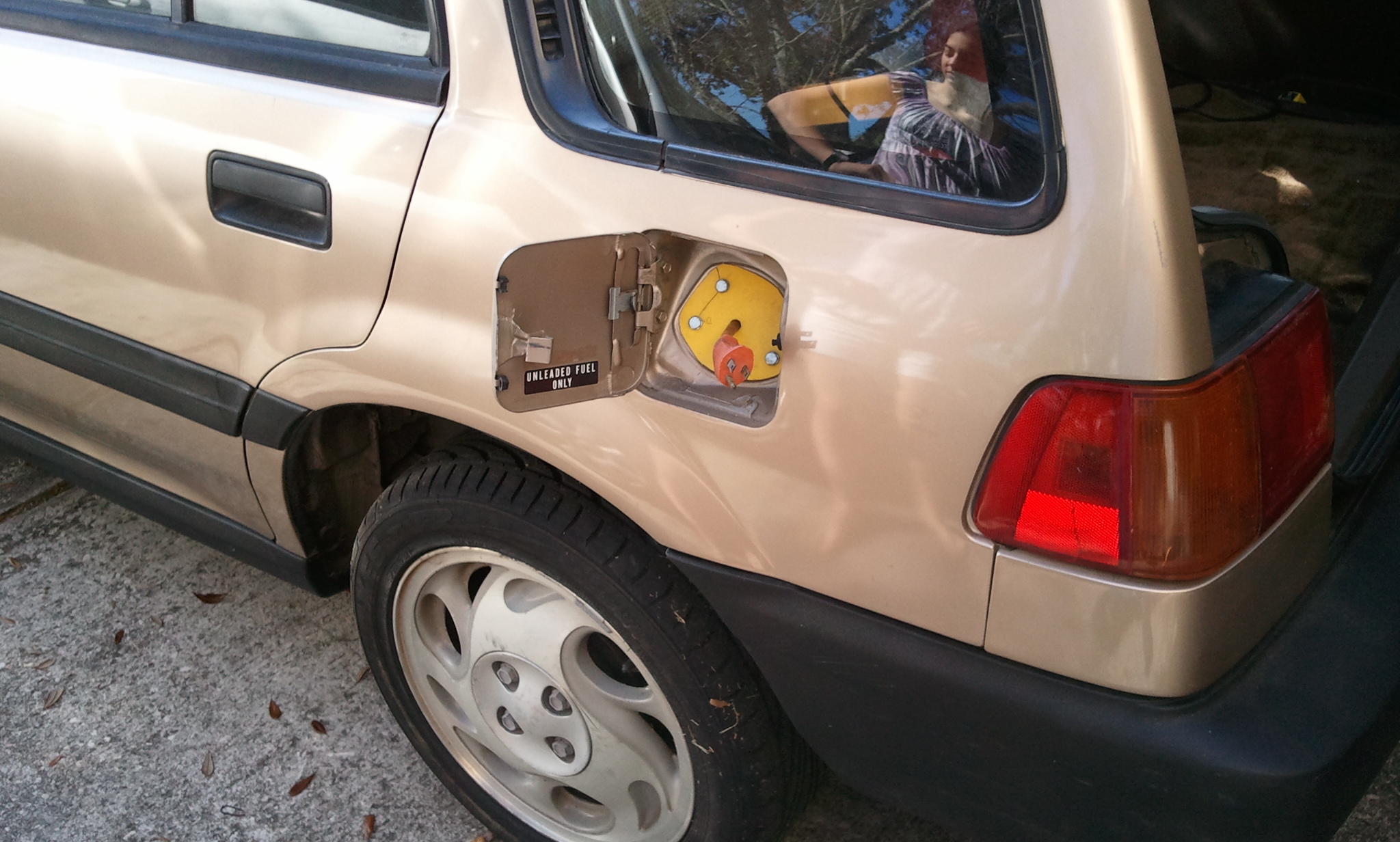 Silent E is a 1988 Honda Civic Wagon converted to a 144V electric vehicle. Mechanically speaking, the engine was replaced with an Advanced DC 9" series-wound motor, the AWD shaft and differential were removed, the gas tank and other gasoline parts were removed, the power steering was replaced with a manual rack, and the clutch was upgraded to a lightweight racing clutch. The only other mechanical modification was the new 15" aluminum rims with low-profile tires that very nearly exactly match the original 13" tire circumference (the speedometer still reads true).