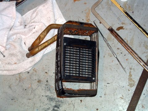 Anyway, we'll need somewhere to mount the electric core. Since the heater box is already set up to accept the edges of the original core, Nathan decided to just cut the inside out of the original core and mount the electric core there instead. Kind of like wrapping the electric core in the original core.