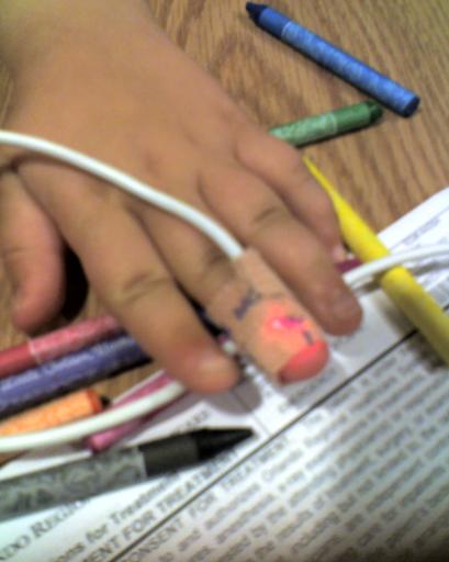 An hour or so later, we were in a room. They told us they didn't have any casts here: they only used splints. They hooked Kayla up to a pulse monitor; she named it "Pinky".