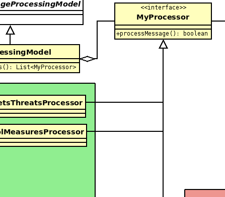 For niceties, Dia has the best alignment and spacing tools I've seen yet (although it doesn't have ArgoUML's "Broom"). The orthogonal inheritance lines were no problem, even when I stacked the dashed lines up. Image saving was a breeze, and it saved only the portion of the diagram that was actually populated. While I thought the styles were a little large and blocky, they're ideal for projecting to a room full of programmers during peer review: readable from the back. And if I really didn't like it, I could've changed the styles.