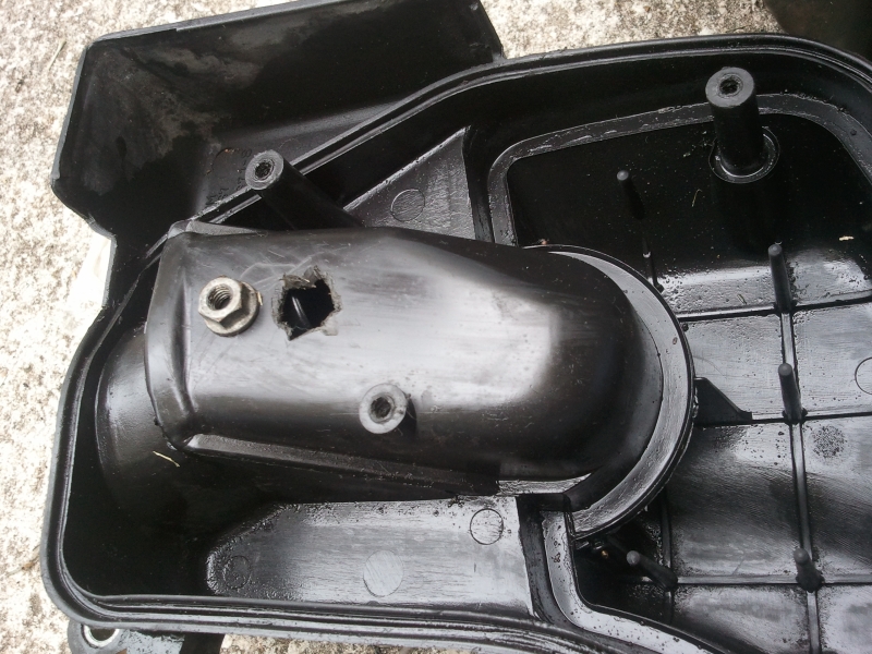 I also tested the fuel valve, which worked; checked the spark, which was fine; pulled an extra gasket out of the air filter box; and plugged an air intake hole (using duct tape). I think someone deliberately hacked out the hole with a screwdriver, to lean out the fuel mixture. Here's a picture, with a 10mm nut next to the hole for scale: