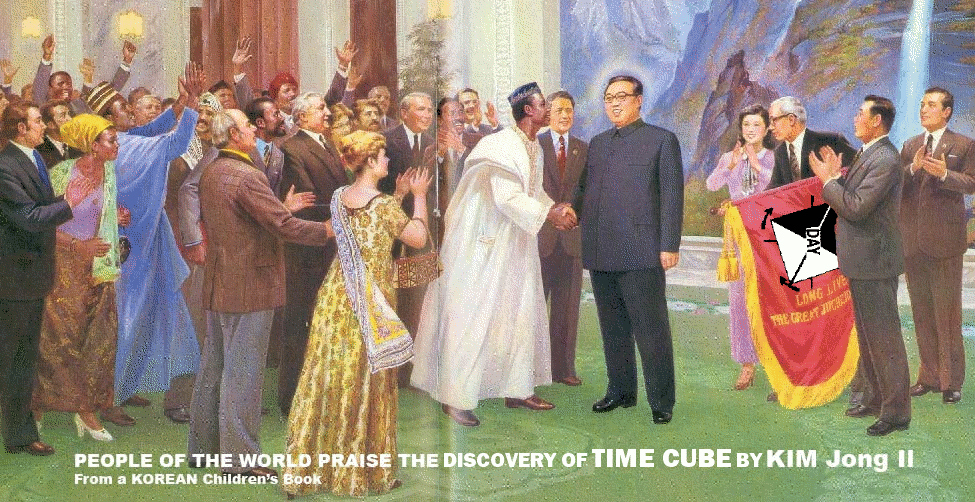 It's a slow Friday here at work, so I entered a Fark photoshop. I made Kim Jong Il the discoverer of the Time Cube, a proposition so thoroughly looney, explained in such a wretched way, that I shall not link to it here. Google it for the most wasted time of your life, if you're so inclined.
