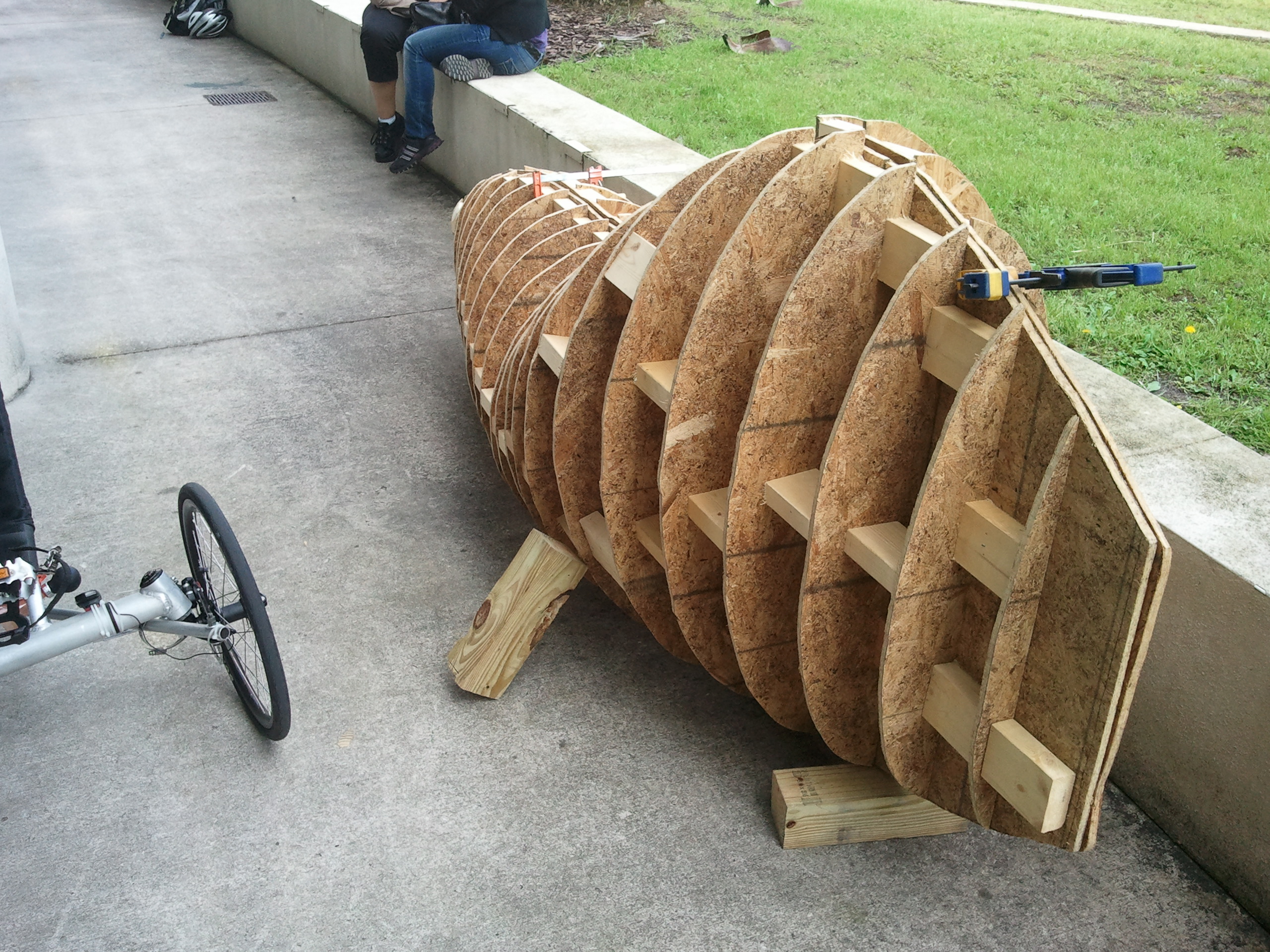 The big part of their project was the faring, though. They originally started with a mostly-cylindrical faring, which had a coefficient of drag (Cd) of 0.07. (Cd measures the force that resists your movement due to disturbing the air: how much your aerodynamics drag you back.) The problem was that the driver couldn't sit up, so couldn't use his back muscles. Or see.