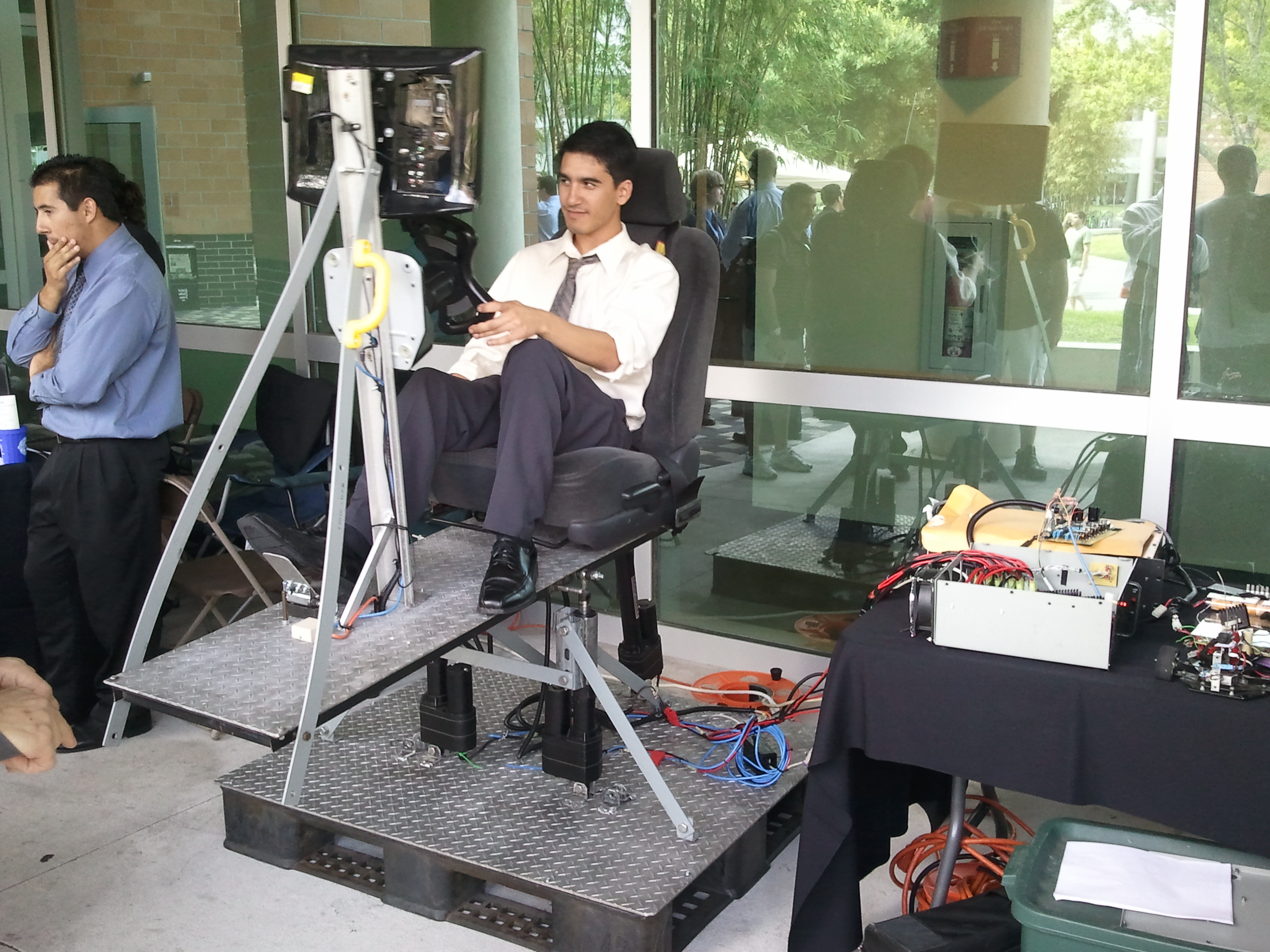 They let Melissa have a go at it. They were only demonstrating their debug mode, of course. (Wouldn't want people ramming the car into strangers.) Turn the wheel, and the motion base tilts to the side. Press the accelerator, and the base tilts up. The video at the top of the page is her getting on; here's one of the end of her ride: