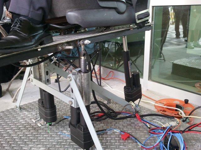 Here's a closeup of the motion base. You can see that this wasn't their initial design: there are mounting brackets slightly farther out than the ones the actuators are currently installed in. One of the mechanical engineers had to convince the others that they didn't need a full "six-degrees-of-freedom", and the base would be more responsive with the actuators pushing straight up.