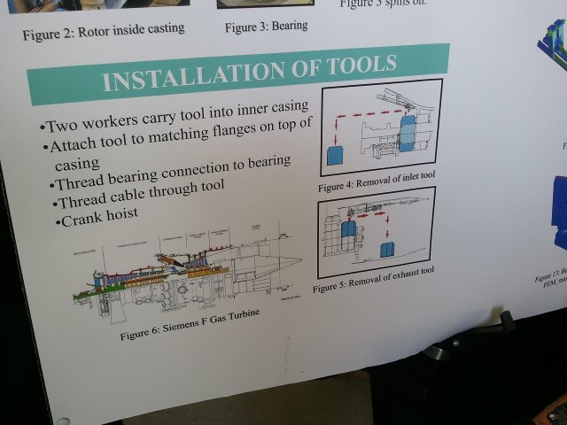 Siemens actually paid them to redesign the existing maintenance system. They've been using a crane on wheels, with a winch on a chain. That new metal bit is a cable-driven trolley that runs in the metal framework I told you about (but don't have a picture of). You run the trolley down to the bearing and detach the "bolt". At this point, the cable runs over the trolley, converting the horizontal motion of the cable to vertical. You attach the bolt to the bearing, then pull the cable up.