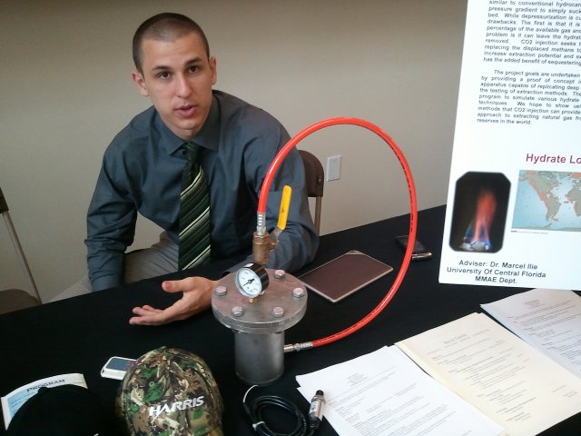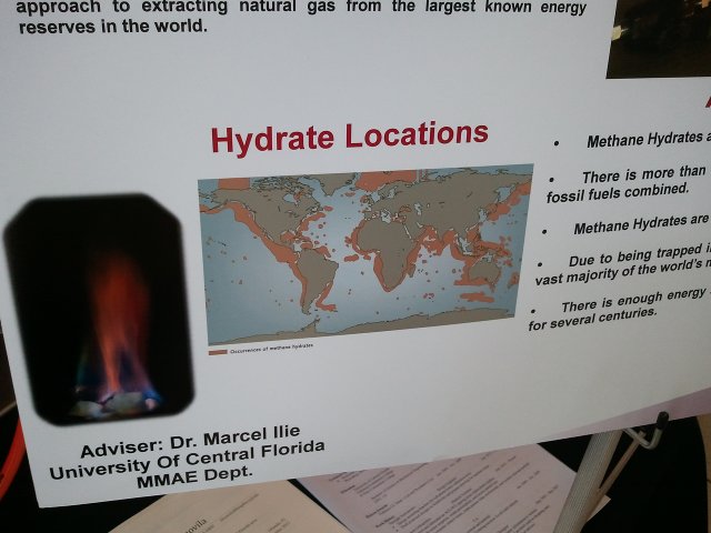 According to their display, there's a lot of methane hydrate in the world. Methane is a natural gas; it's said to be environmentally better than gasoline. Unfortunately, most of it is caught up in methane hydrate, rendering it useless. It's also difficult to extract, because it's usually in slush or methane ice. By the time you get it, it's heated up and evaporated.