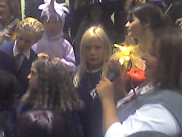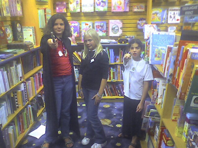 The kids were "dueling" in the kids' section. There was a taped area on the floor, and prospective wizards would shout at each other. You could hear it clear across the store, despite the background roar. After the show, the kids told me that some brat tried to tease them about their homemade wands. Now personally, I like these wands a lot; one is a gnarled, gray, druidic tree branch, while the other is curved and elegant. He had a store-bought plastic wand that lit up when you shook it. He started by criticizing my kids' wands, then moved on to their dueling ability. My kids were having none of it. Unfortunately, their skills in the insult are only marginally better than, "Oh, yeah?"